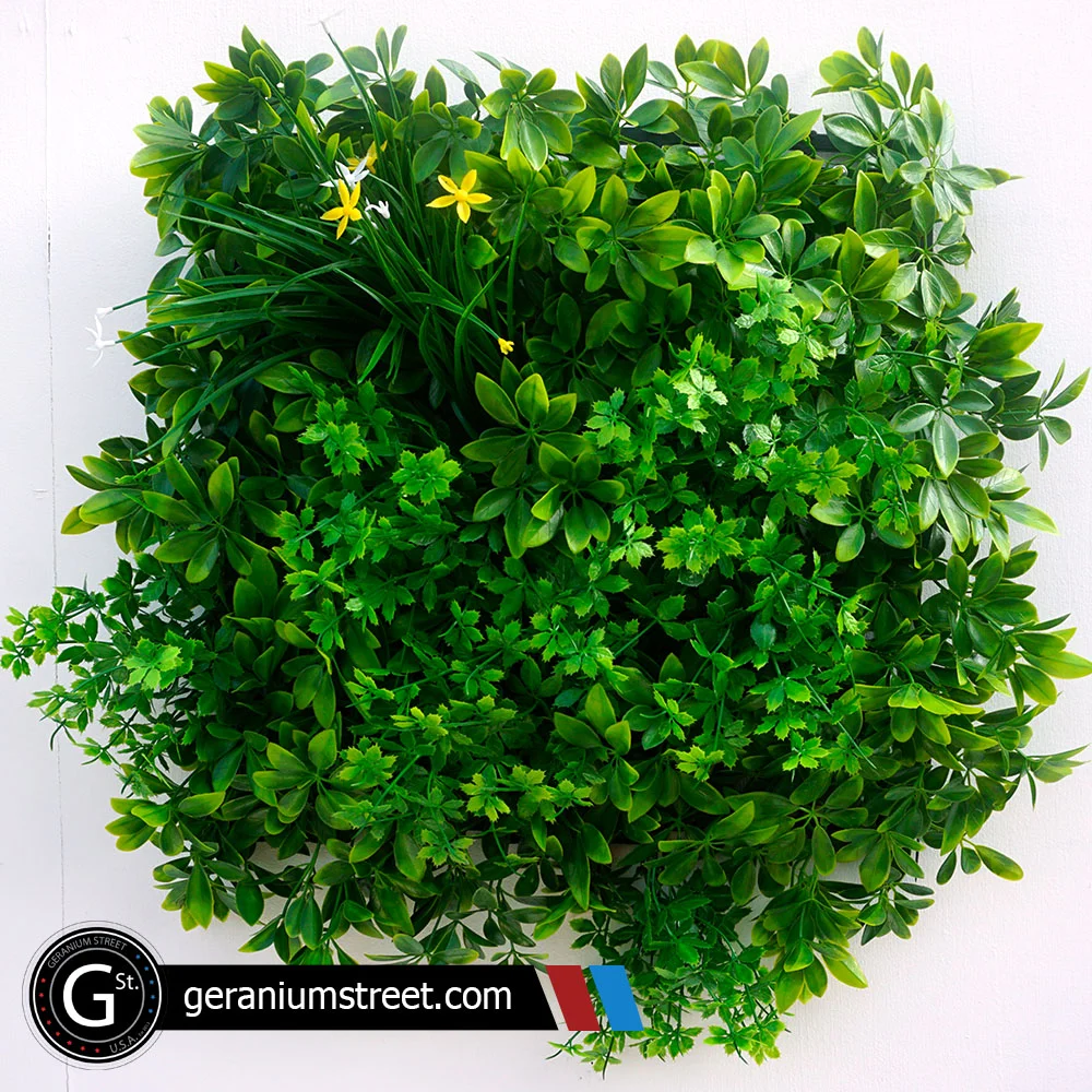 Our flagship Oasis Mat delivers maximum visual impact with its diverse mix of premium artificial foliage. This panel combines multiple plant varieties - ferns, leaves, grasses, and flowering elements - to create the effect of a naturally grown vertical garden.